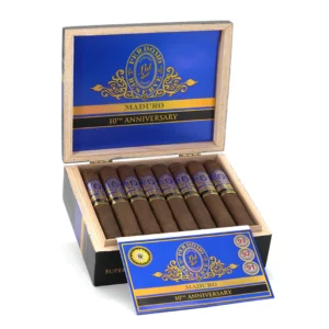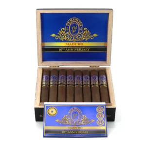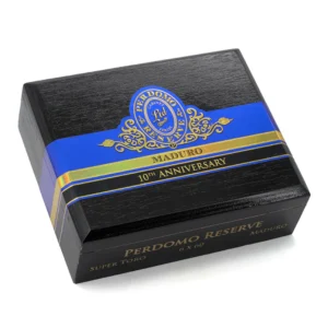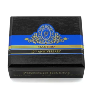 Perdomo Reserve 10th Anniversary Box-Pressed Maduro features a medium to full-bodied profile with bourbon barrel-aged wrappers, offering sweet dark cocoa and espresso notes.